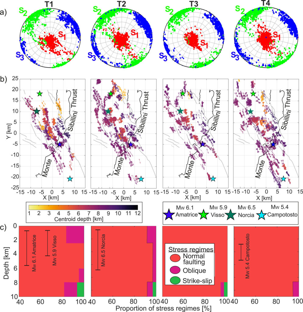 We analyze the evolution of stress parameters from the 2016–2017 central Italy seismic sequence taking advantage of ∼13,747 robust focal mechanisms from a deep learning catalog. The density of the catalog allows us to invert focal mechanisms over distances of a few km and different time periods. We inferred a number of stress-related parameters, including the fault plane variability, the orientation of principal stress axes and maximum horizontal stress, the relative magnitudes of principal stresses and the variability of the principal stress orientations with respect to the median. From the uniform regional stress field consistent with the extension of the Apennine Belt, we observe local stress heterogeneities that are driven by the structural features and the coseismic stress history. A variation of the principal stress magnitudes and regimes from pure normal faulting toward transtension with depth is observed. Stress differences at the 1–10 km wavelength are observed between each side of two of the main regional fault structures. The reported stress results suggest a partial mechanical coupling and a strong interaction between the shallow normal faults and the detachment horizon at depth. Furthermore, distinct trends are observed in the stress parameters after the largest mainshocks, and before the MW 6.5 Norcia mainshock, potentially indicating the high shear stress still available in well oriented faults after the MW 6.0 Amatrice earthquake. Our analysis holds implications toward (a) constraining stress magnitudes, (b) illuminating the interaction between the shallow normal faults and detachment horizons, and (c) tracking stress evolution during seismic sequence.